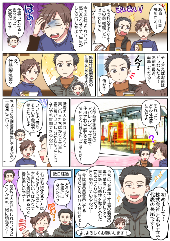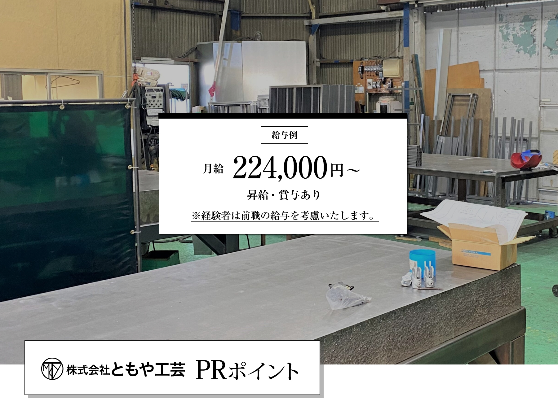 ともや工芸は、大型商業施設などで使用されている商品を陳列する什器を製造する会社です。 什器制作におけるスチール(鉄)の溶接(半自動・アルゴン・ガス等)を担当していただきます。主に、半自動溶接で、鉄パイプ・板金・線材の溶接を行っていただきます。 溶接での経験をお持ちの方はもちろん、未経験の方も大歓迎。技術の指導から必要な資格の取得まで、サポート体制は万全です。