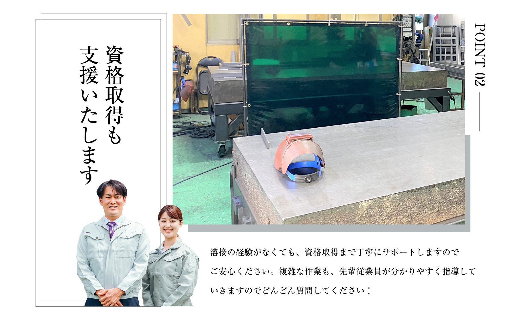 | 職種 | 溶接スタッフ ★未経験から職人に! ★土日祝休み(土曜日は当社カレンダーによる) ★未経験でも月給20万円~スタート! ★30代・40代活躍中! ★一生モノのスキルを当社でGETできます ★面接時に作業場見学もOKです! |