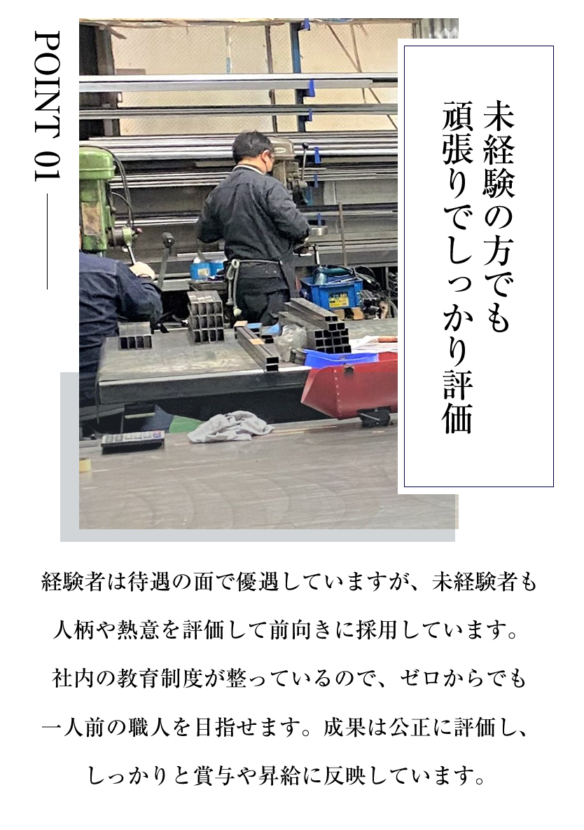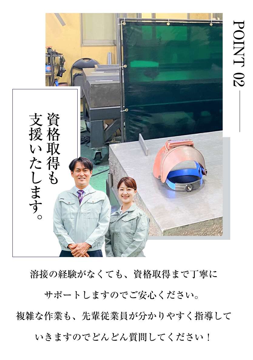 | 職種 | 溶接スタッフ ★未経験から職人に! ★土日祝休み(土曜日は当社カレンダーによる) ★未経験でも月給20万円~スタート! ★30代・40代活躍中! ★一生モノのスキルを当社でGETできます ★面接時に作業場見学もOKです! |